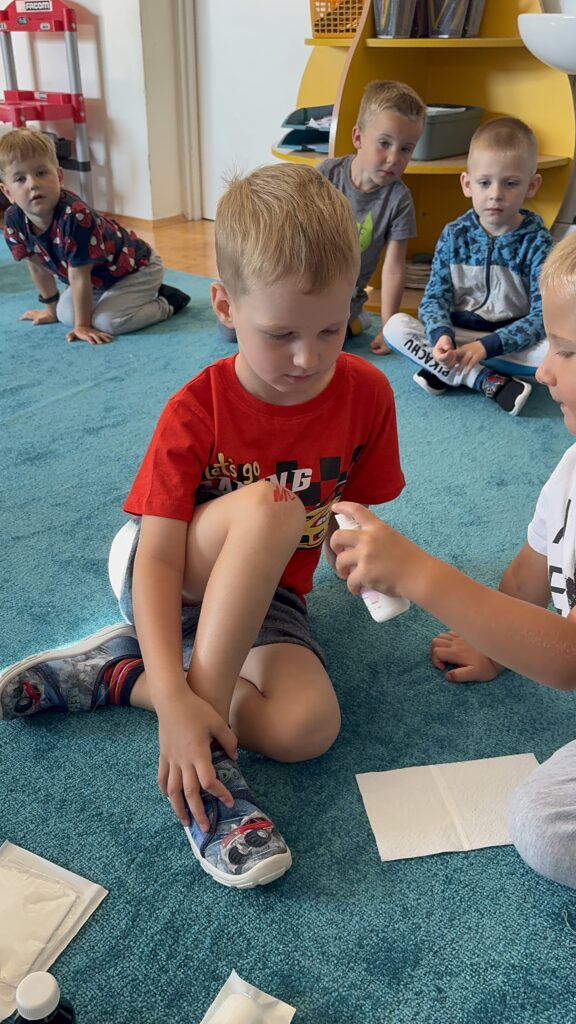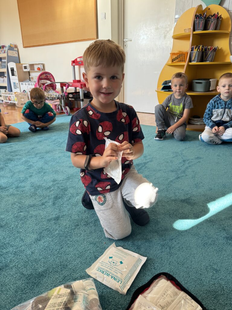Dzieci dowiedziały się, do czego służy koc ratowniczy, jak wyglądają opatrunki oraz w jaki sposób można wykonać proste bandażowanie. Wszystkie aktywności były dostosowane do wieku przedszkolaków, dzięki czemu nauka przebiegała w atmosferze zabawy i ciekawości.