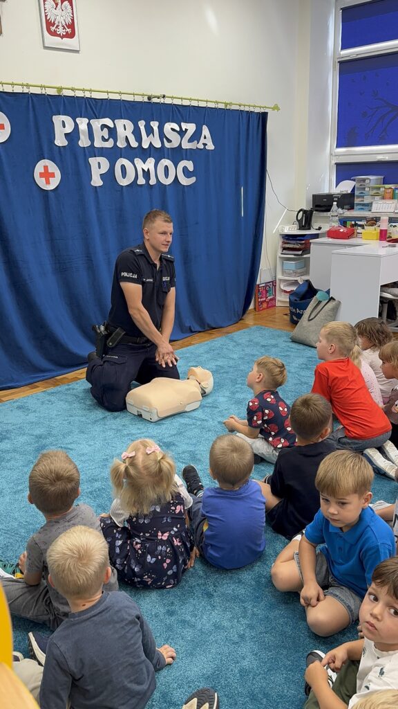 Dużym wydarzeniem była wizyta policjantów z Komisariatu Policji w Kluczach, którzy opowiedzieli dzieciom o zasadach resuscytacji krążeniowo‑oddechowej (RKO). Funkcjonariusze pokazali, jak wygląda udzielanie pomocy w sytuacji zagrożenia życia i podkreślili, jak ważne jest szybkie reagowanie.