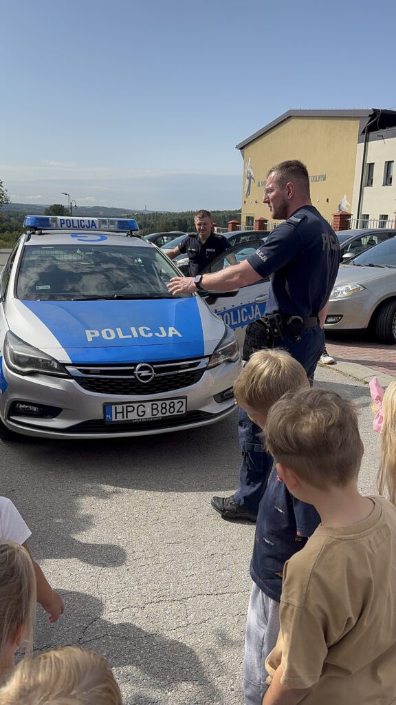 Po części edukacyjnej na dzieci czekała wyjątkowa atrakcja — prezentacja policyjnego radiowozu. Przedszkolaki mogły zajrzeć do środka pojazdu, zobaczyć jego wyposażenie oraz posłuchać, jak brzmi sygnał dźwiękowy. Policjanci pokazali również różne atrybuty swojego zawodu, takie jak kamizelka odblaskowa, lizak policyjny czy środki łączności.