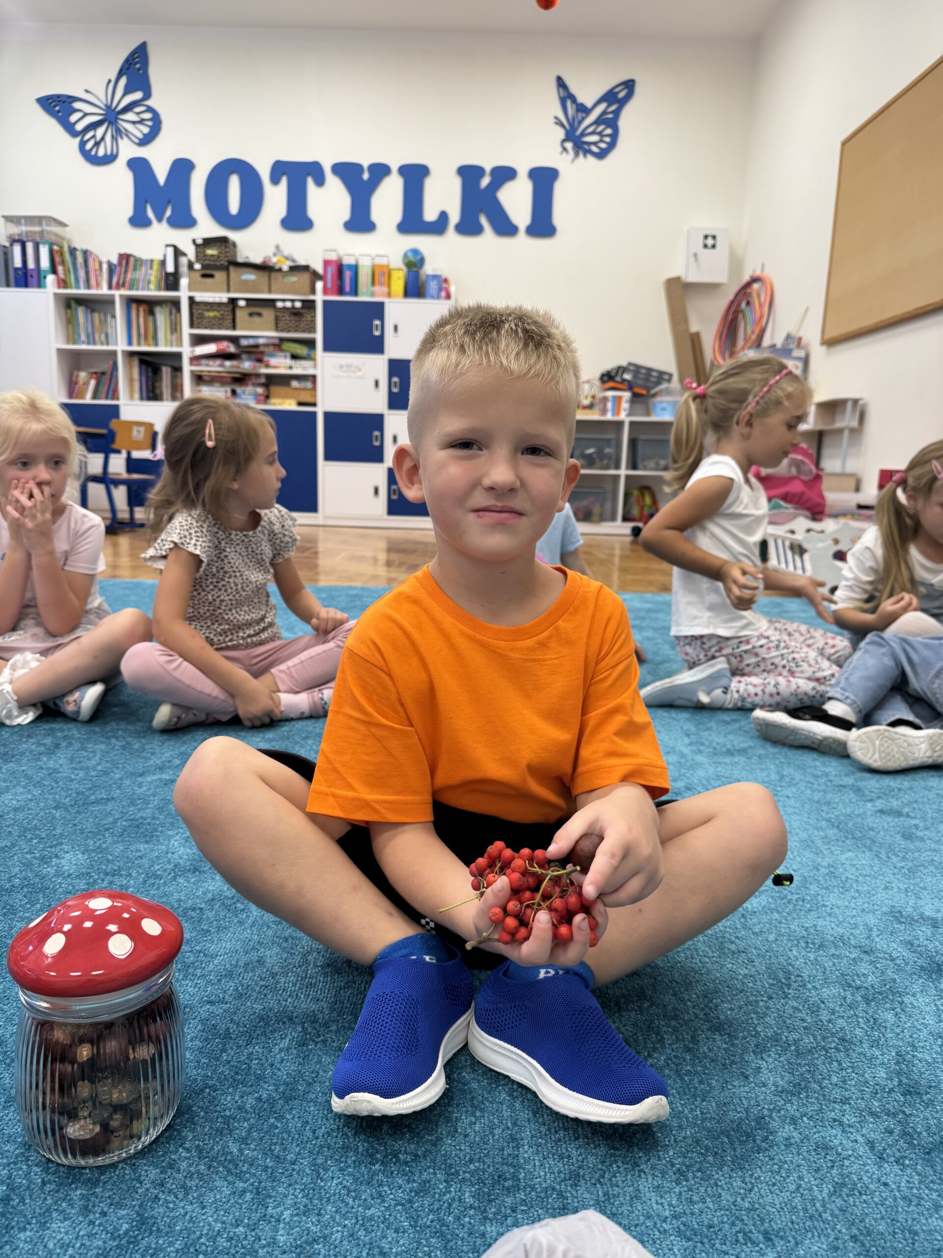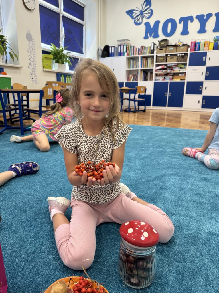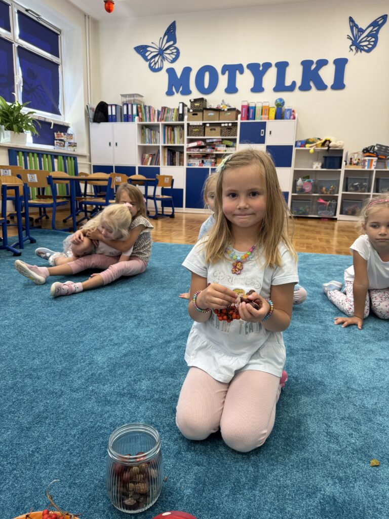 Przedszkolaki z wielkim entuzjazmem przyniosły do sali dary jesieni: kasztany, żołędzie, jarzębinę oraz szyszki. Każdy przyniesiony skarb był okazją do rozmowy o zmianach zachodzących w przyrodzie i o tym, jak różnorodna potrafi być jesień.