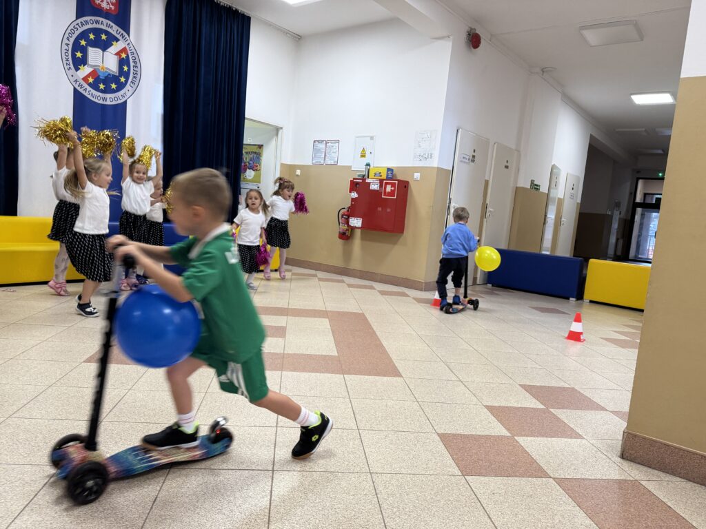 Następnie przyszedł czas na wyścigi hulajnogowe. Kolorowe kaski, sportowe emocje i głośne okrzyki kibiców sprawiły, że atmosfera była jak na prawdziwym torze wyścigowym. Każdy uczestnik dał z siebie wszystko, a radość z udziału była ważniejsza niż miejsce na podium.