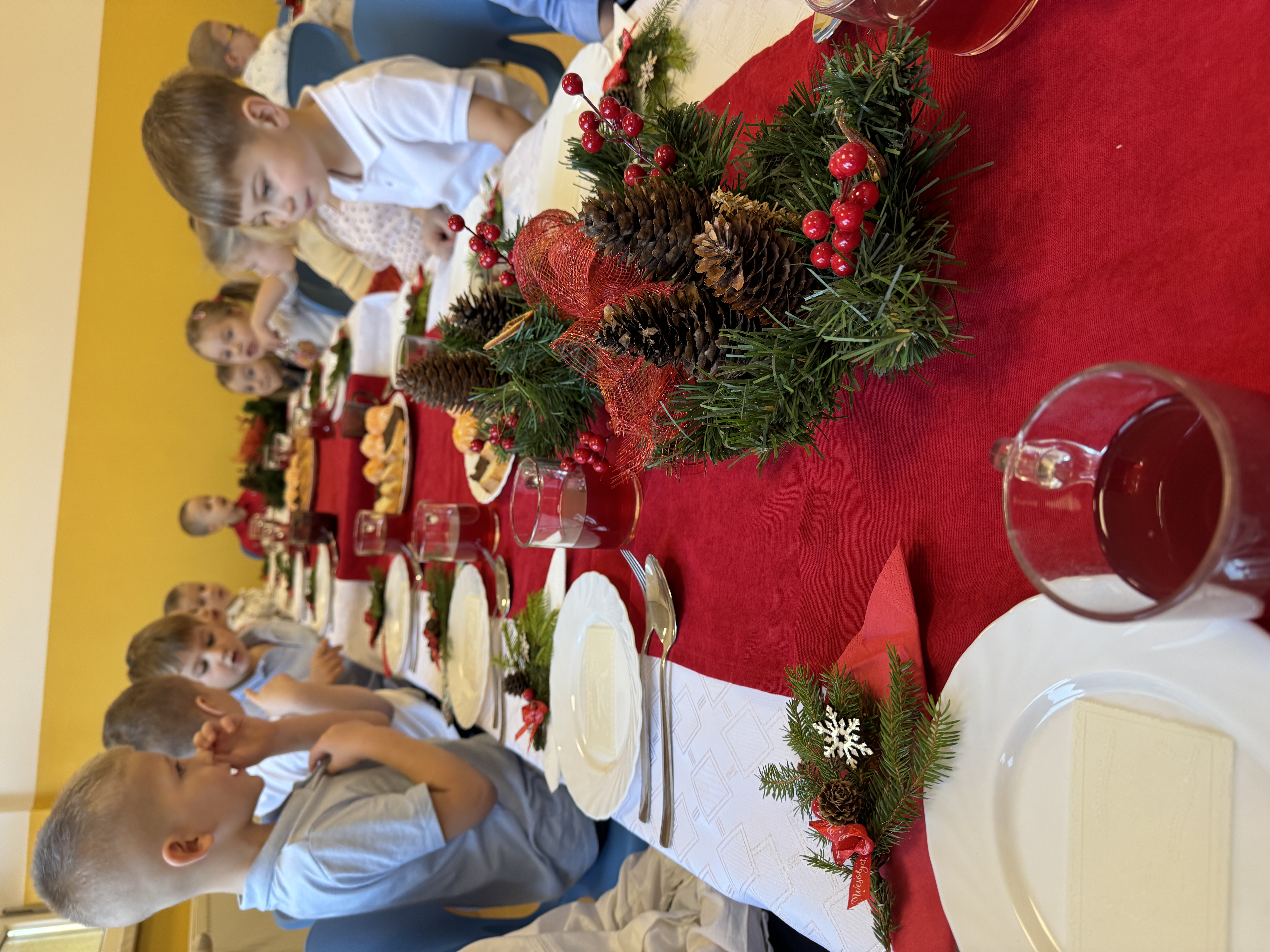 Dzisiejszy dzień wypełniła wyjątkowa, świąteczna atmosfera. Przedszkolaki zasiadły do tradycyjnego obiadu wigilijnego, który – jak co roku – był dla nich nie tylko pysznym posiłkiem, ale też okazją do wspólnego przeżywania magii świąt.